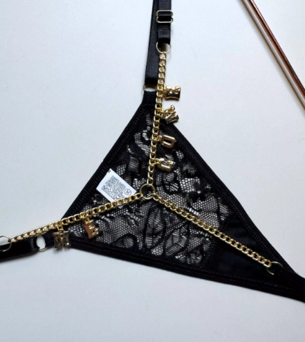 Tanga regulável confeccionada em renda, com correntes e dizeres dourados, regulagem em metal dourado, fundinho forrado em algodão.